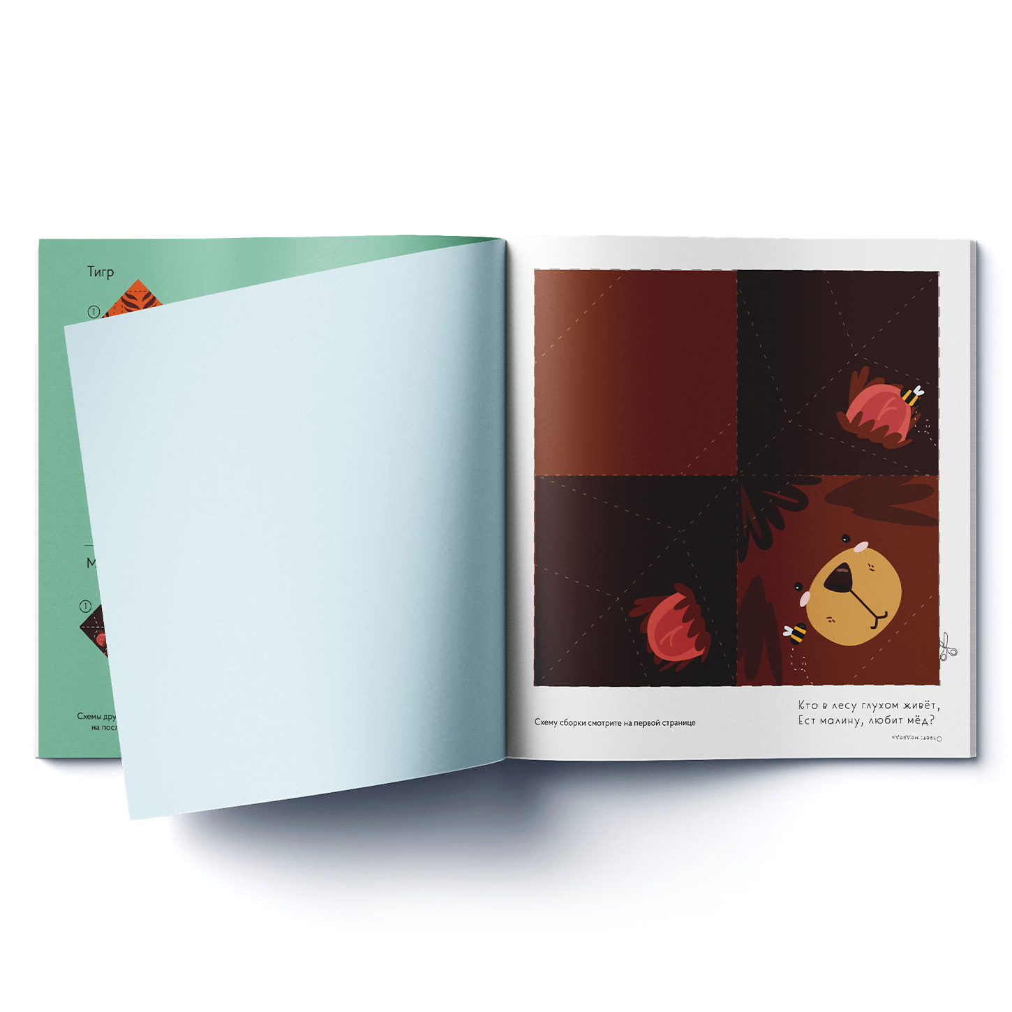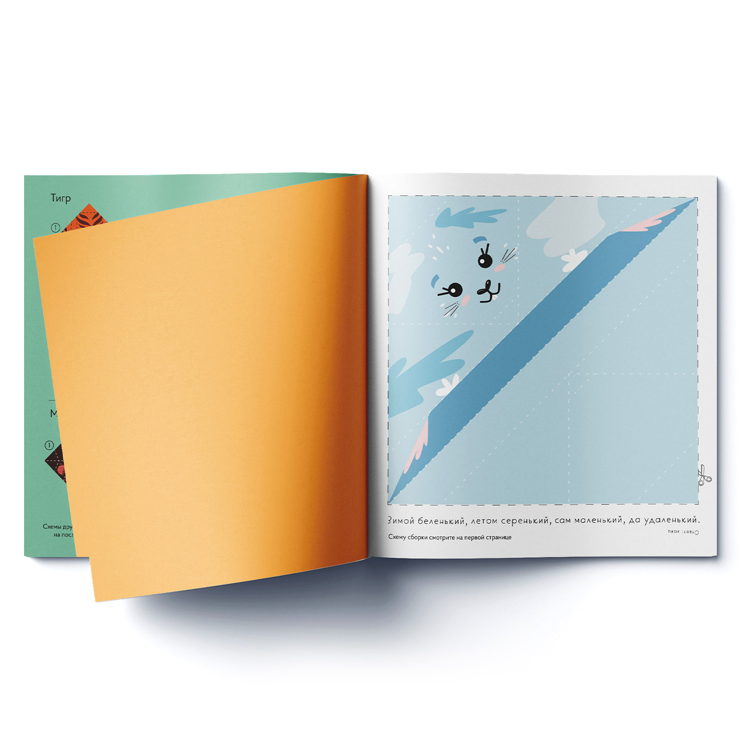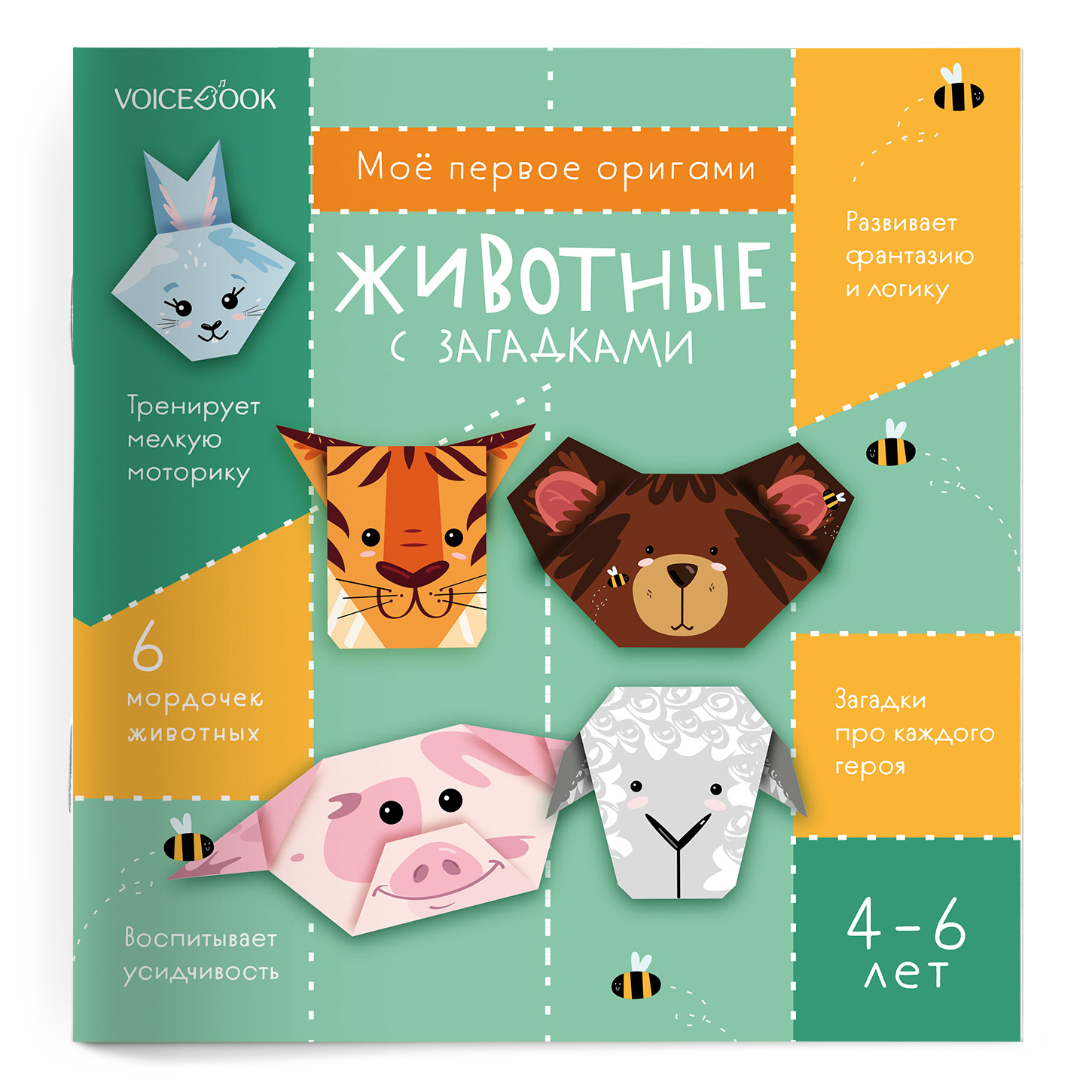 Это альбом с набором из 6 мордочек забавных животных для поделок-оригами: заяц, тигр, поросенок, корова, медведь, овечка. Все, что понадобится для творческого занятия с детьми 3-5 лет, находится внутри конверта: пошаговая схема-инструкция сборки фигурок оригами и QR-код с подробной видеоинструкцией, бумажные листы для поделок оригами и загадки про каждого героя, чтобы собирать фигурки было еще интереснее.